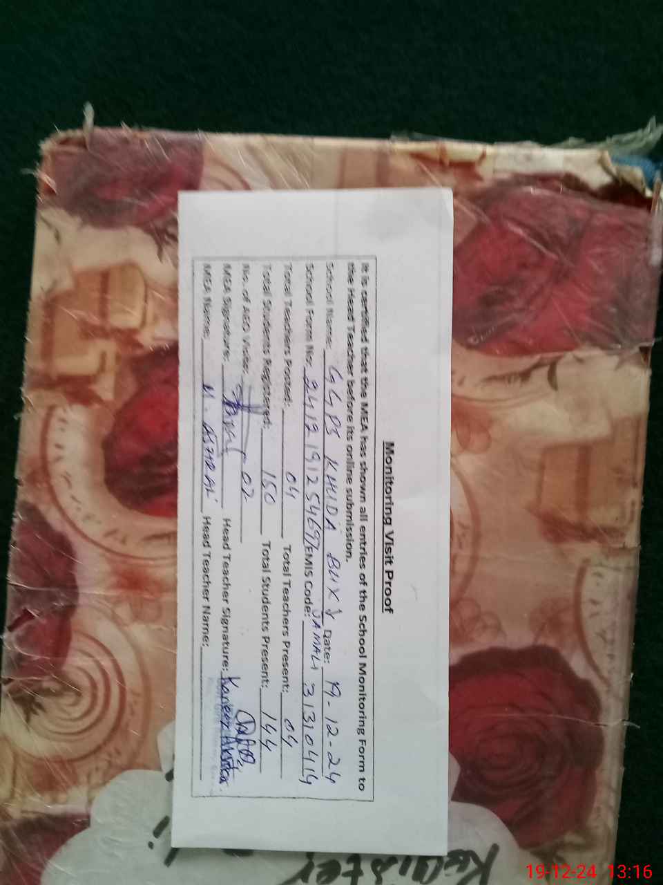 | Attendance Register | Head Teacher | MEA with School | Visit Proof |