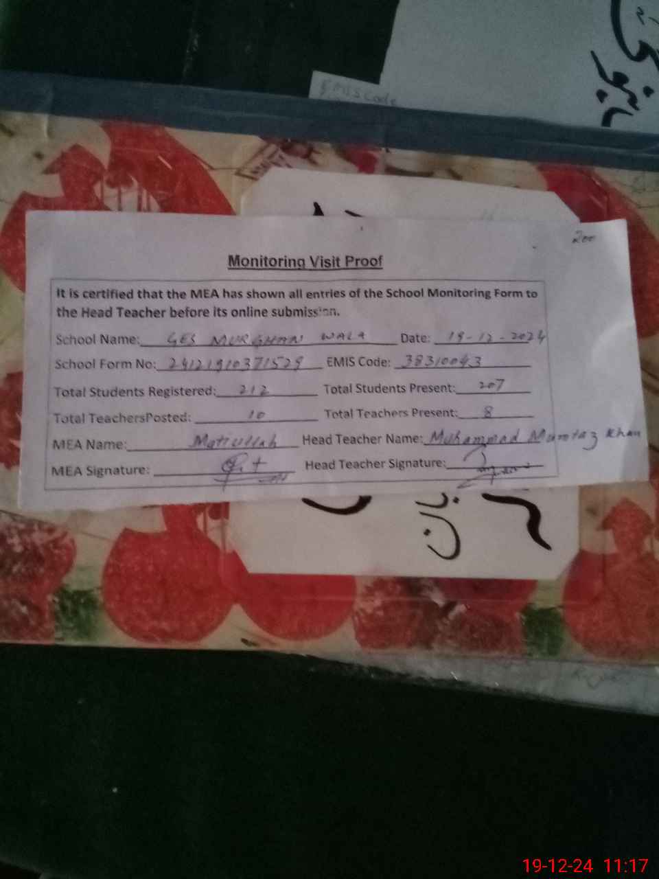 | Certified that this School was Inspected by the Undersigned MEA/DMO Today and the Information Stated Above is as Per Record. | |||||
