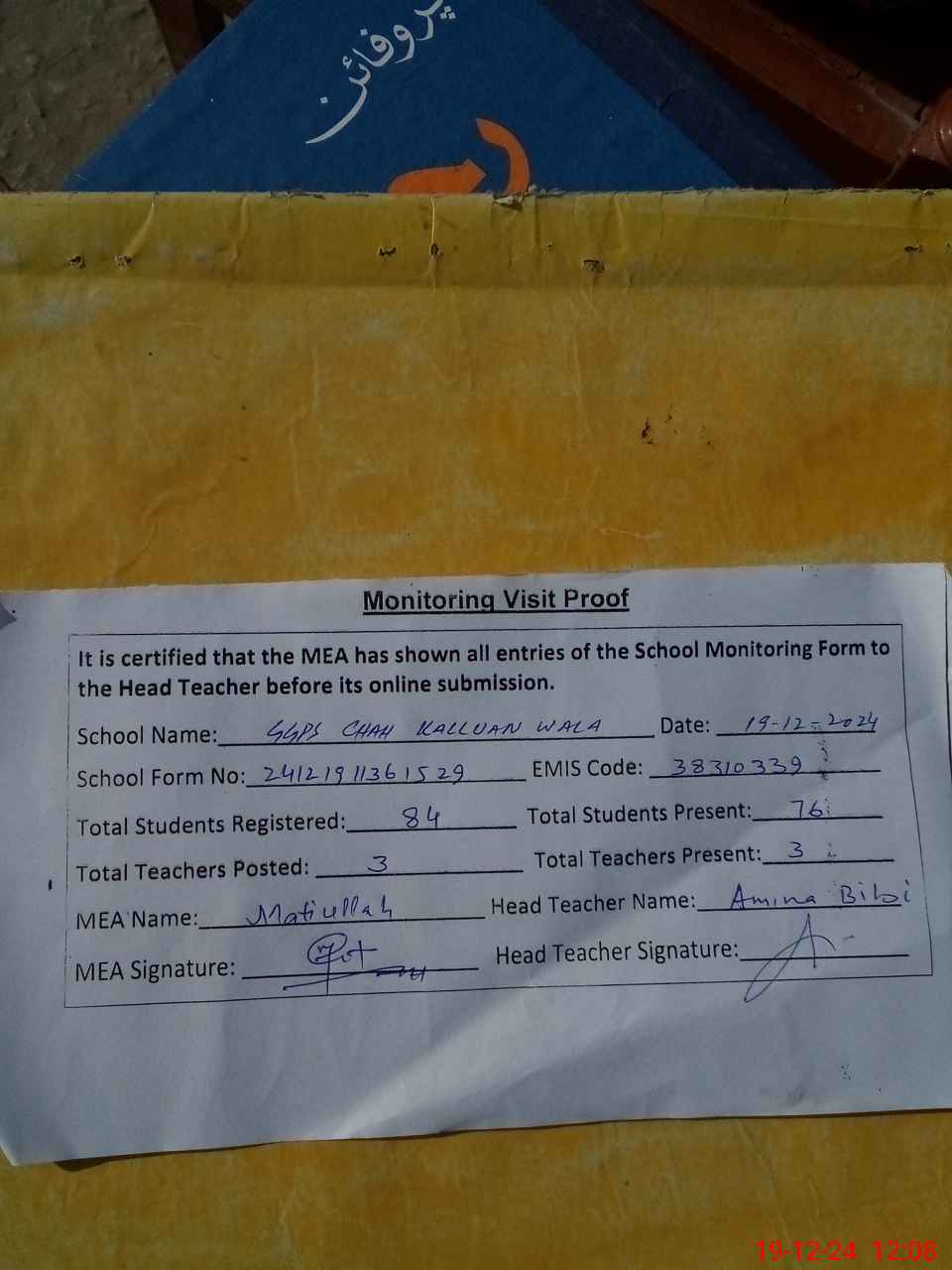 | Attendance Register | Head Teacher | MEA with School | Visit Proof |