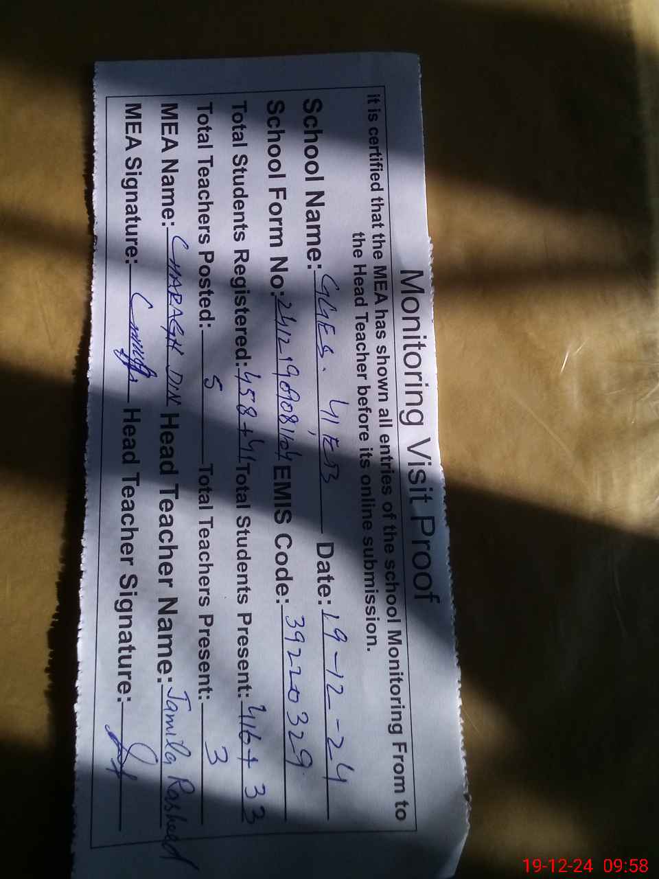 | Attendance Register | Head Teacher | MEA with School | Visit Proof |