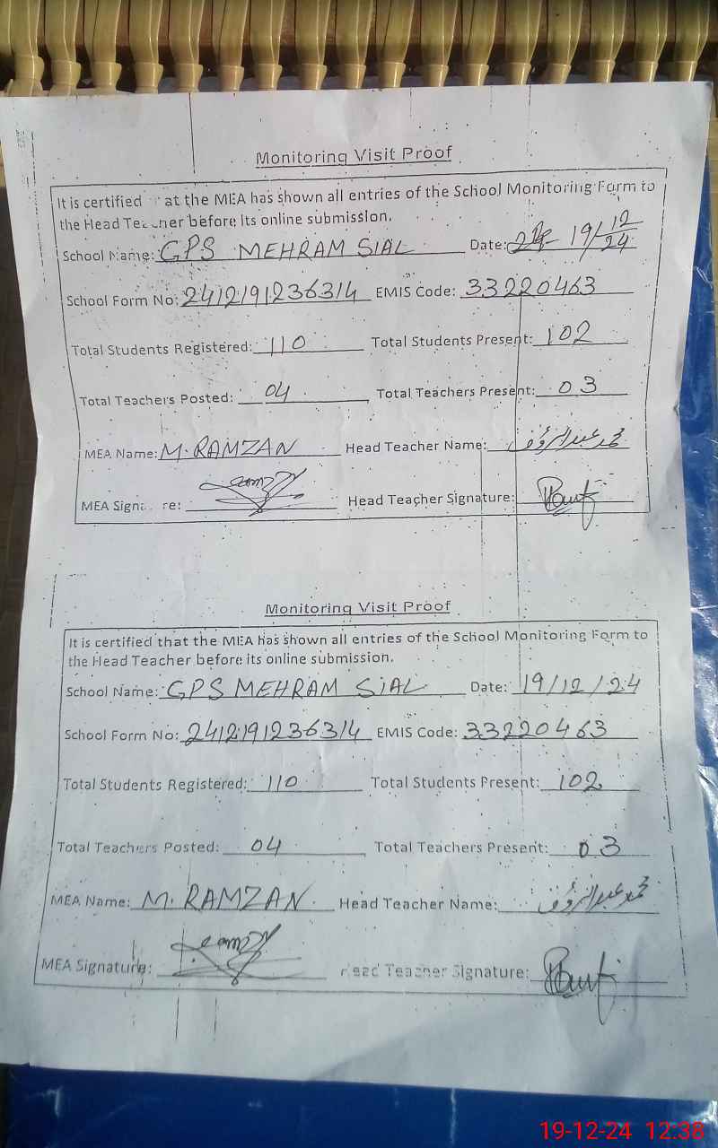 | EMIS Code: 33220463 | Name of School: GPS MEHRAM SIAL | |||
