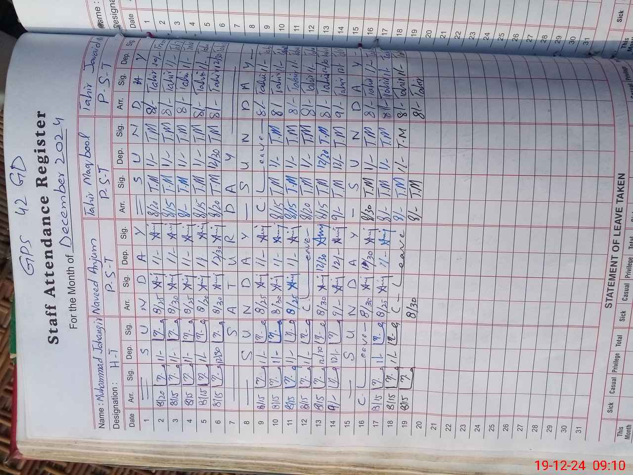 | CNIC | Full Name | Designation | R/C | Absence During Last Calender Month |