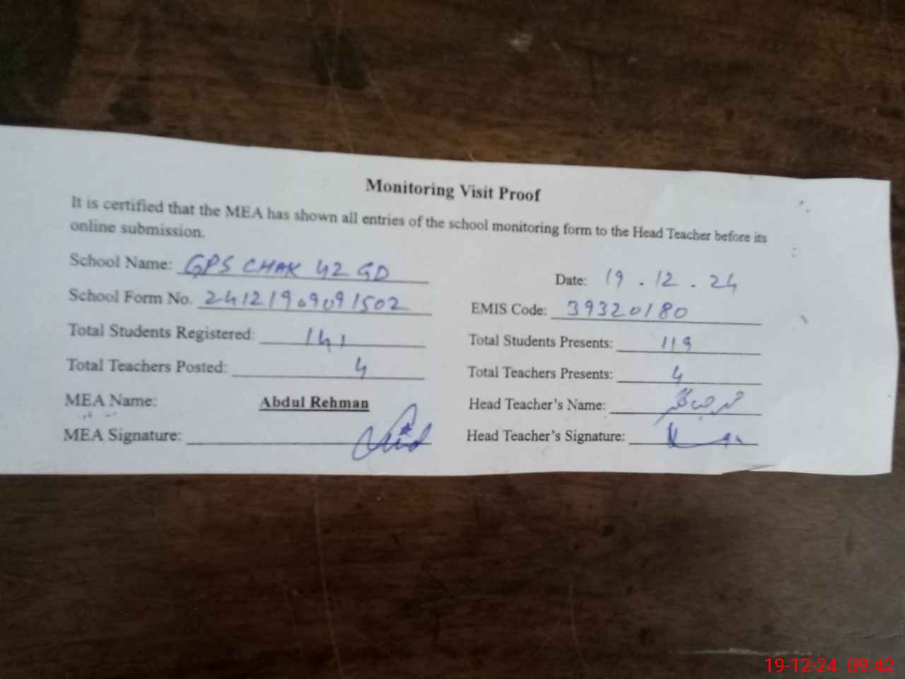 | Attendance Register | Head Teacher | MEA with School | Visit Proof |