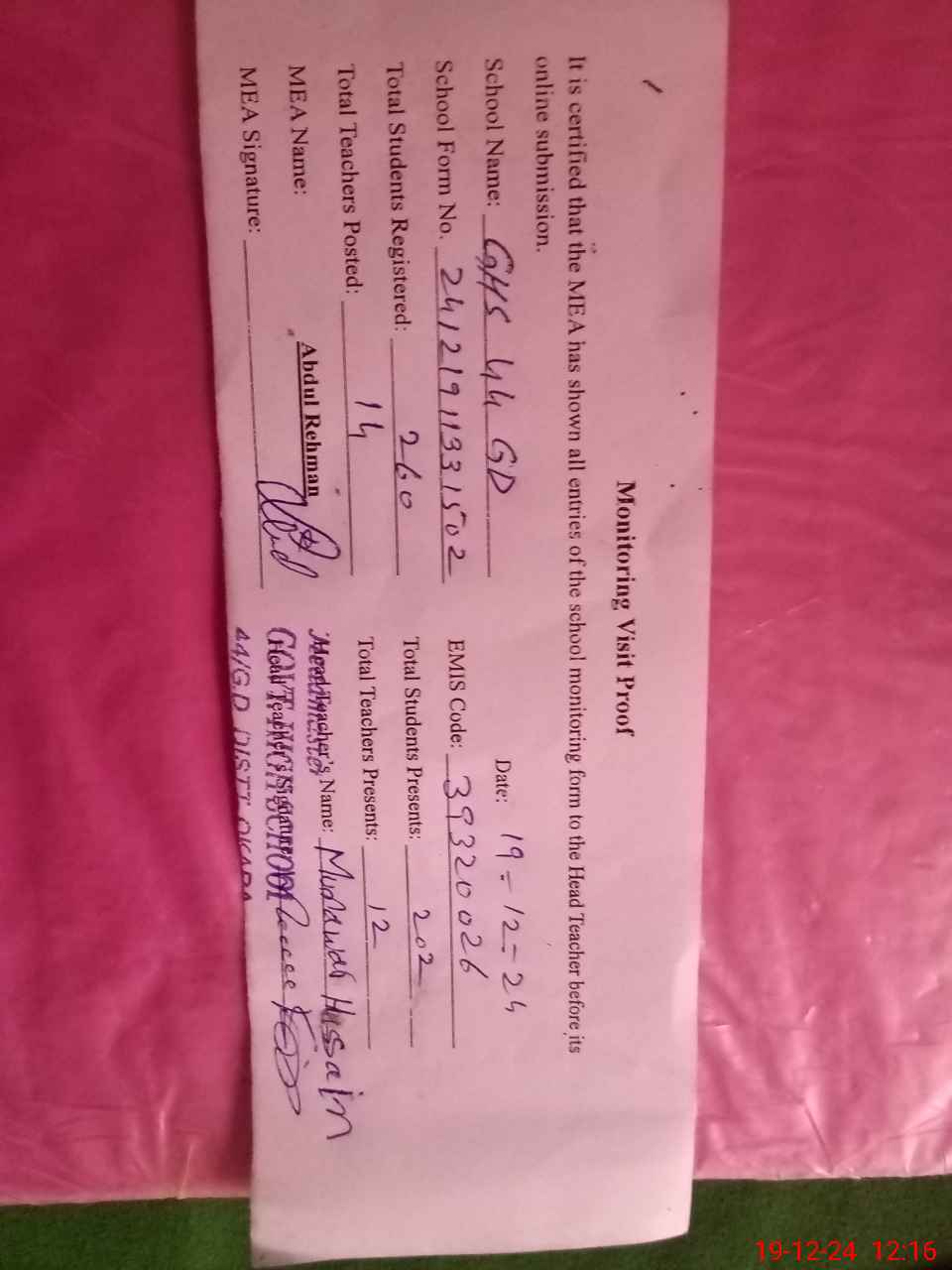| Certified that this School was Inspected by the Undersigned MEA/DMO Today and the Information Stated Above is as Per Record. | |||||