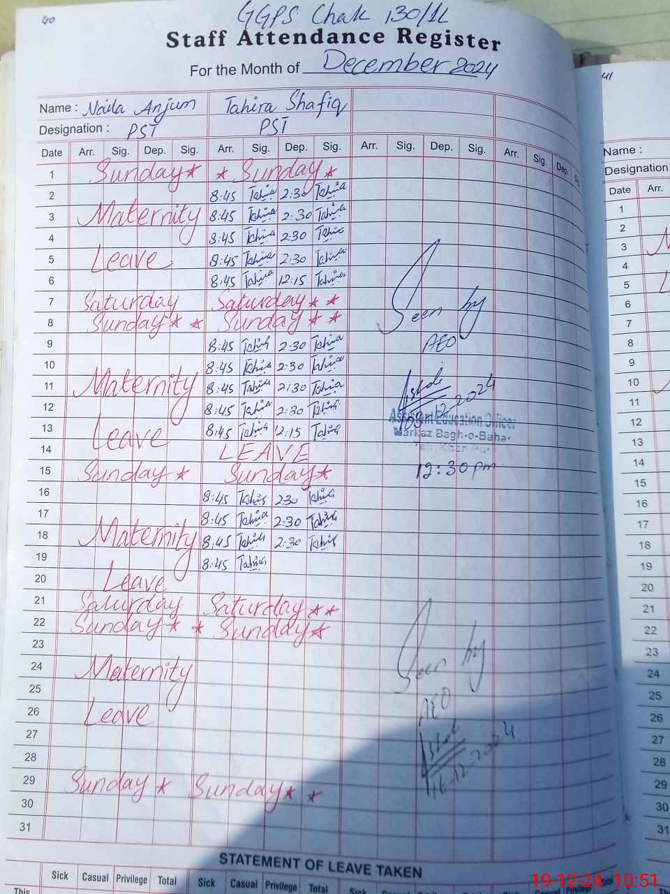 | 31**** | Na**** An**** | PST | Regular | 11 | 0 | 0 | 10 | 0 | 0 | 0 | 0 | 1 | Maternity |