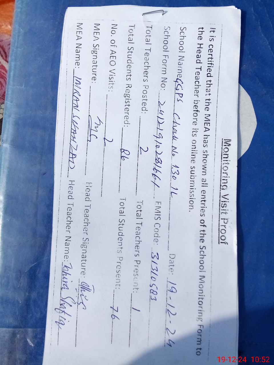 | Attendance Register | Head Teacher | MEA with School | Visit Proof |