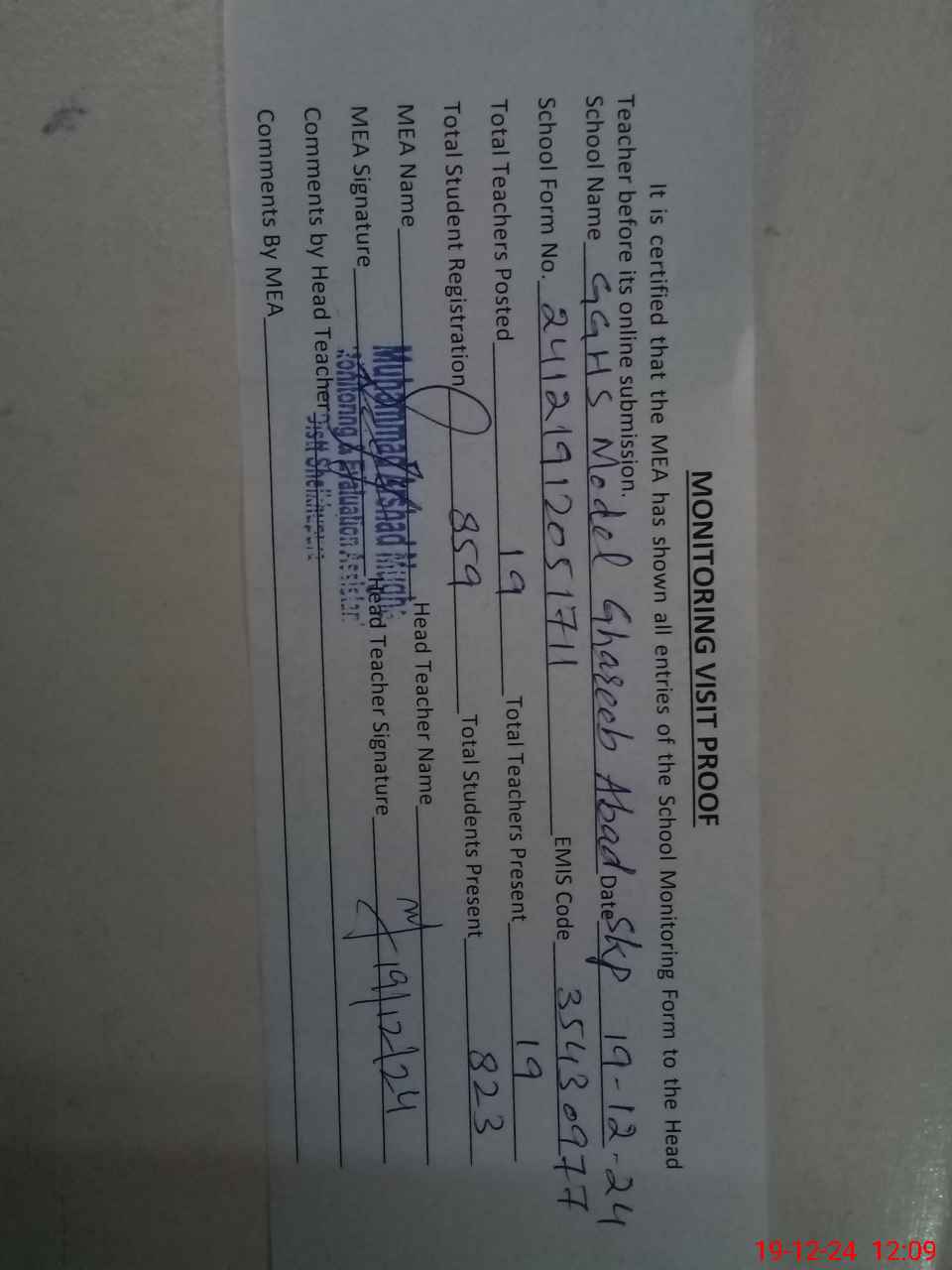 | Attendance Register | Head Teacher | MEA with School | Visit Proof |