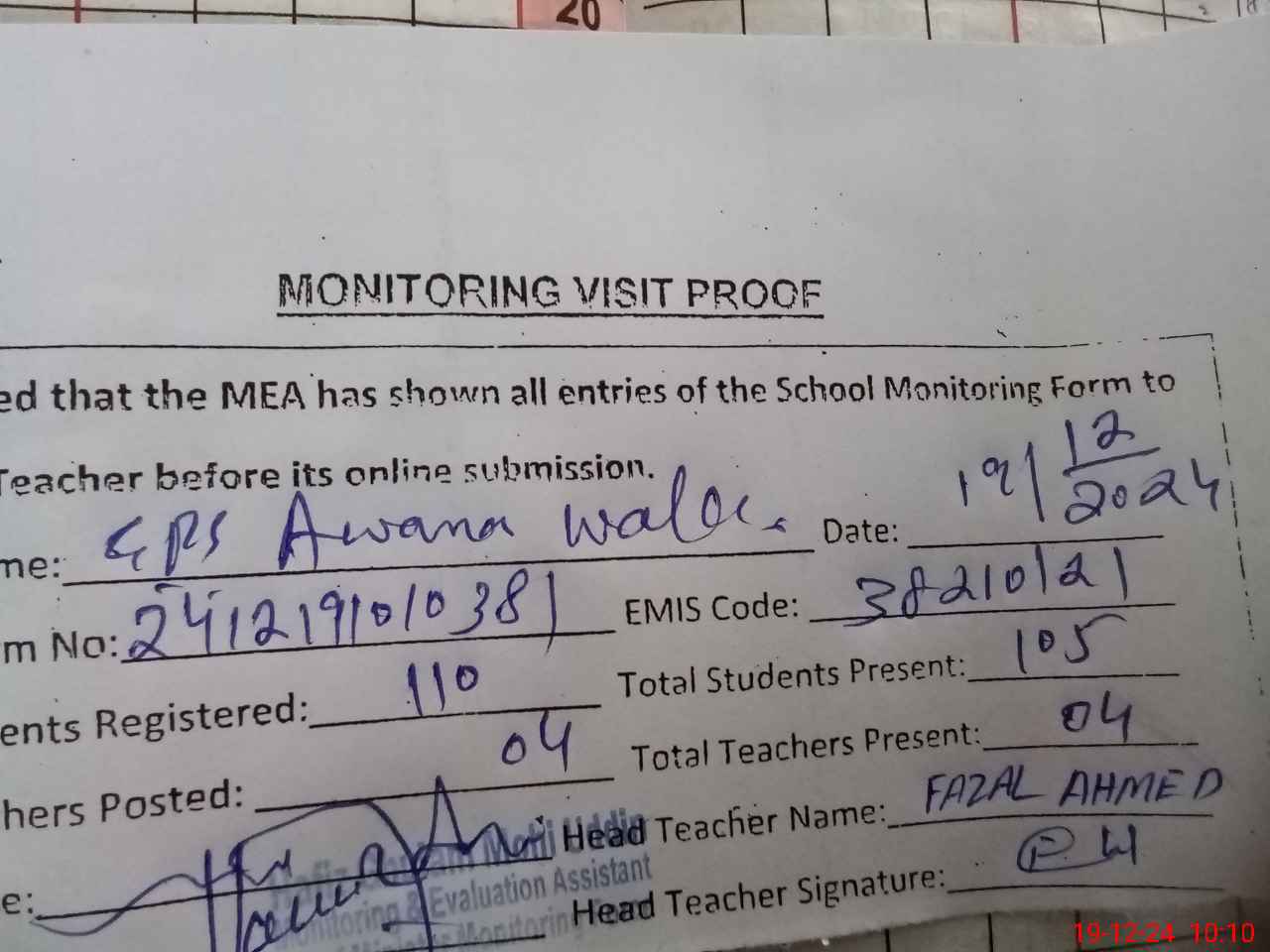 | EMIS Code: 38210121 | Name of School: GPS AWANA WALA | |||