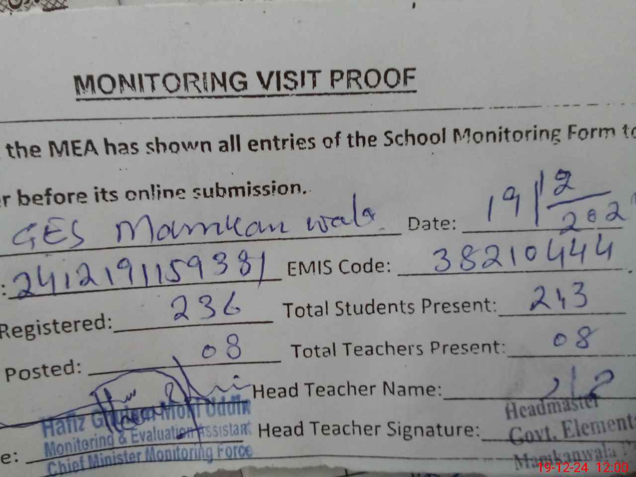 | Attendance Register | Head Teacher | MEA with School | Visit Proof |