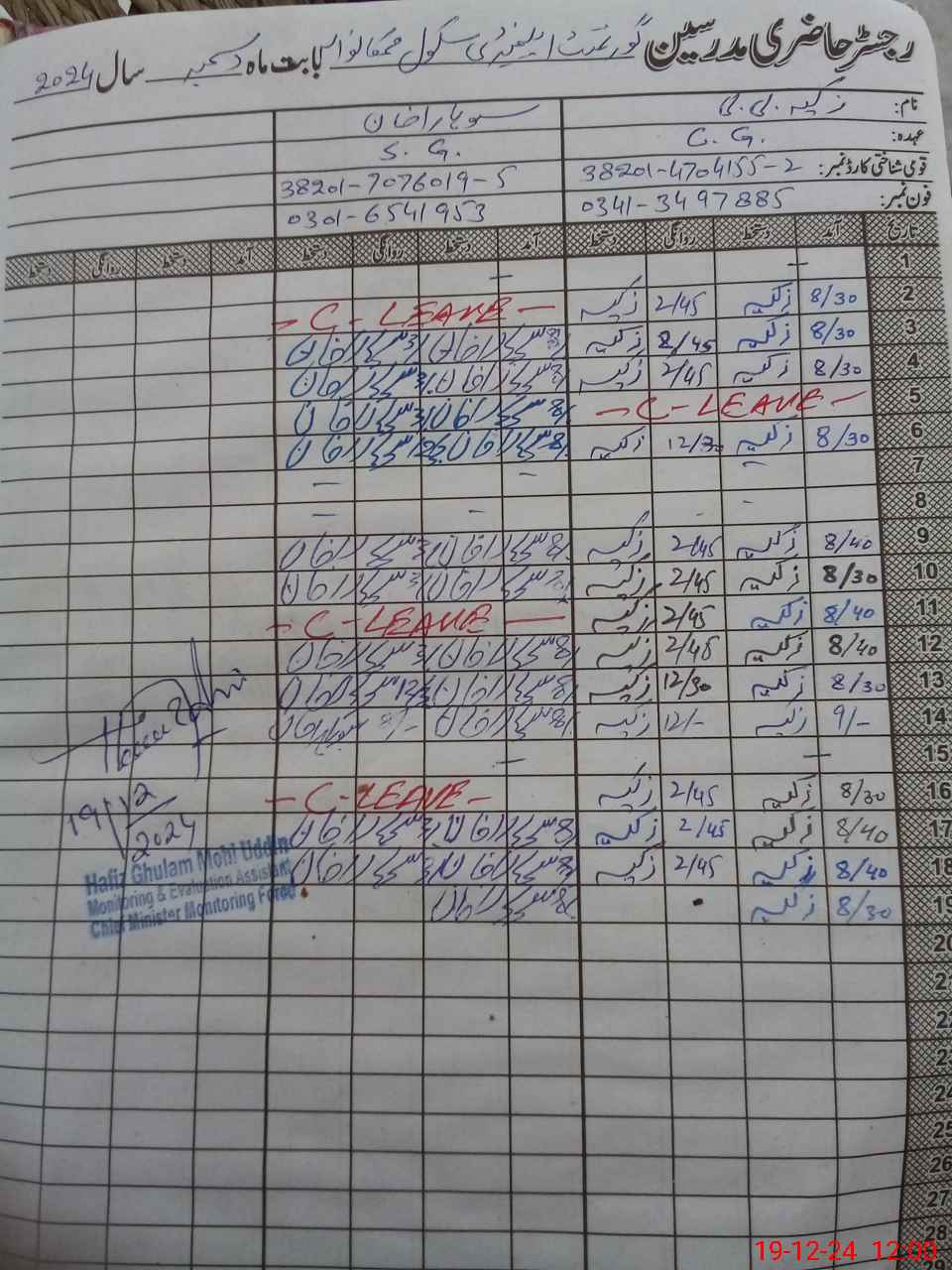 | CNIC | Full Name | Designation | R/C | Absence During Last Calender Month |