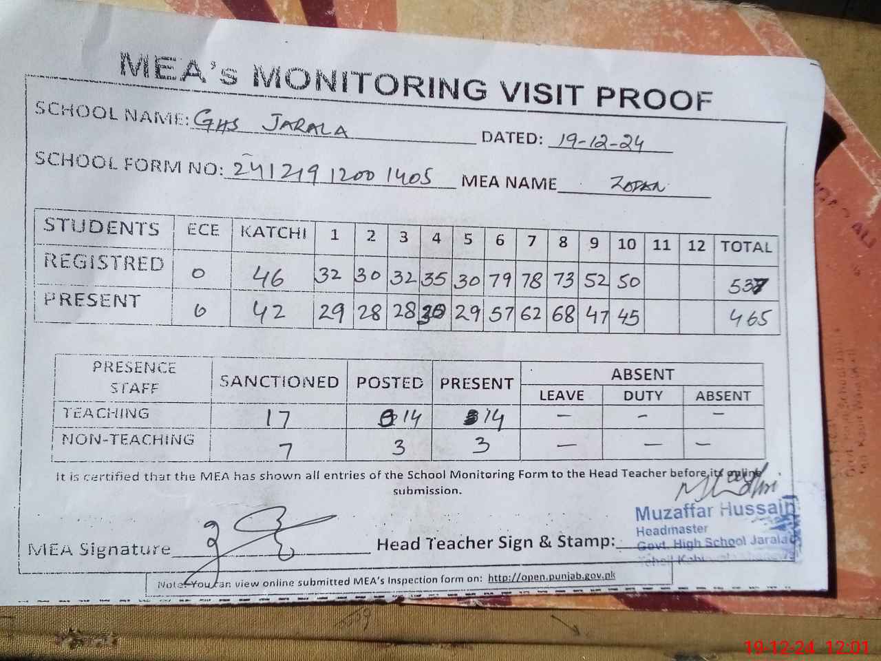 | Attendance Register | Head Teacher | MEA with School | Visit Proof |
