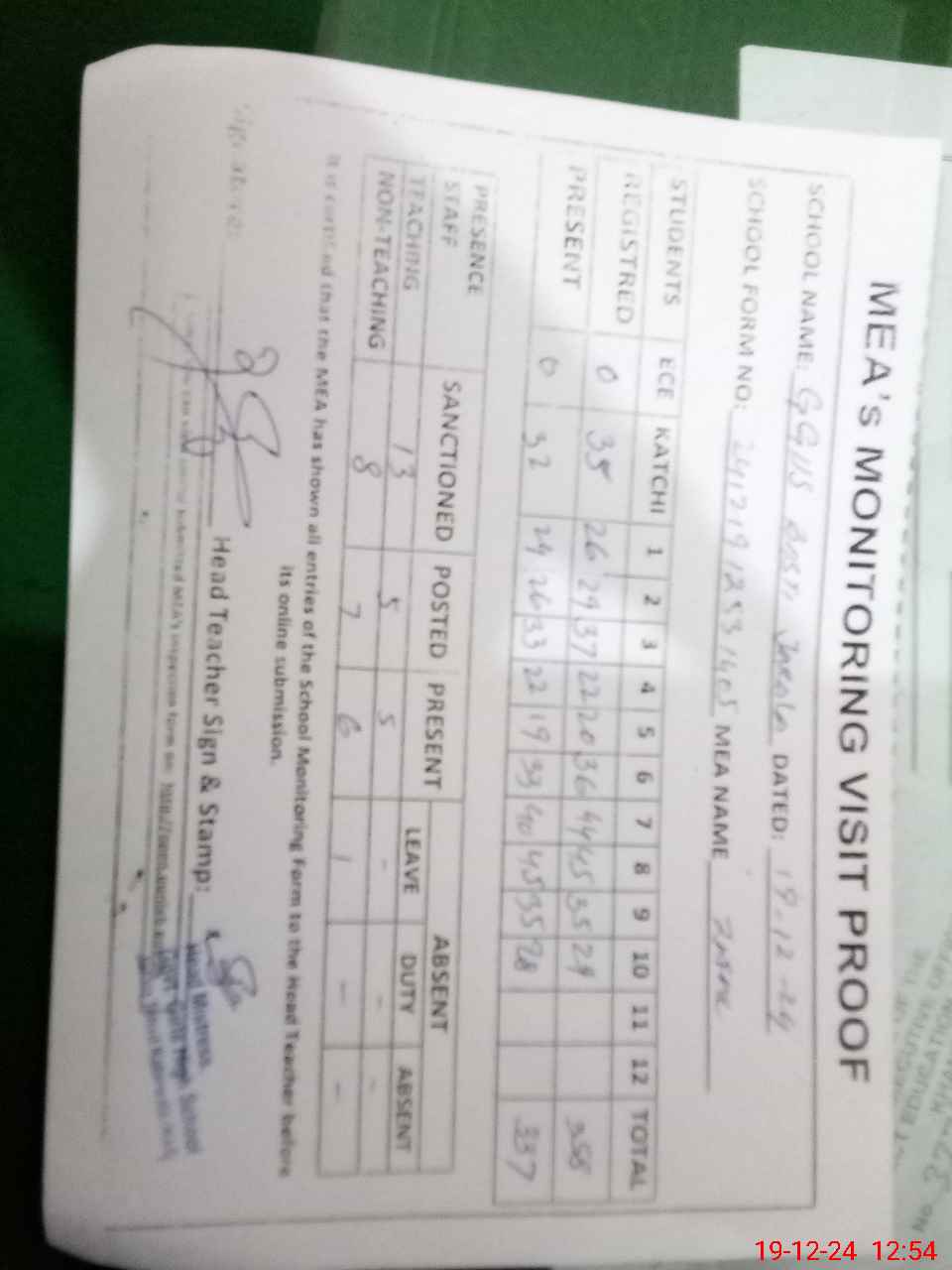 | Attendance Register | Head Teacher | MEA with School | Visit Proof |