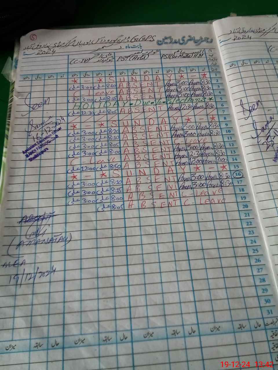 | Remarks (Use Separate Page if Required): Head Teacher Aneesa Khanam and PST teacher Javeria Naseer both teachers absent from School | |||||