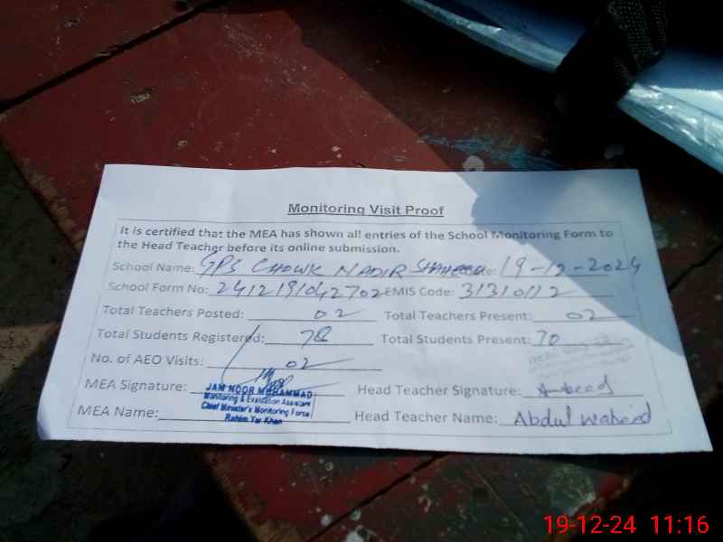 | EMIS Code: 31310112 | Name of School: GPS CHOWK NADIR SHAHEED (After Noon) | |||