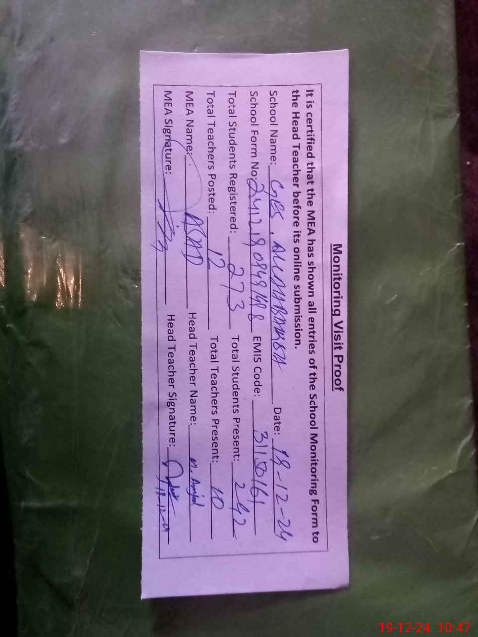 | Attendance Register | Head Teacher | MEA with School | Visit Proof |