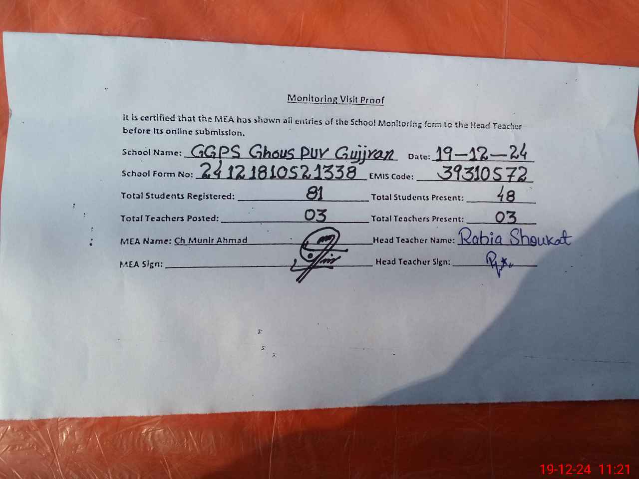 | Attendance Register | Head Teacher | MEA with School | Visit Proof |