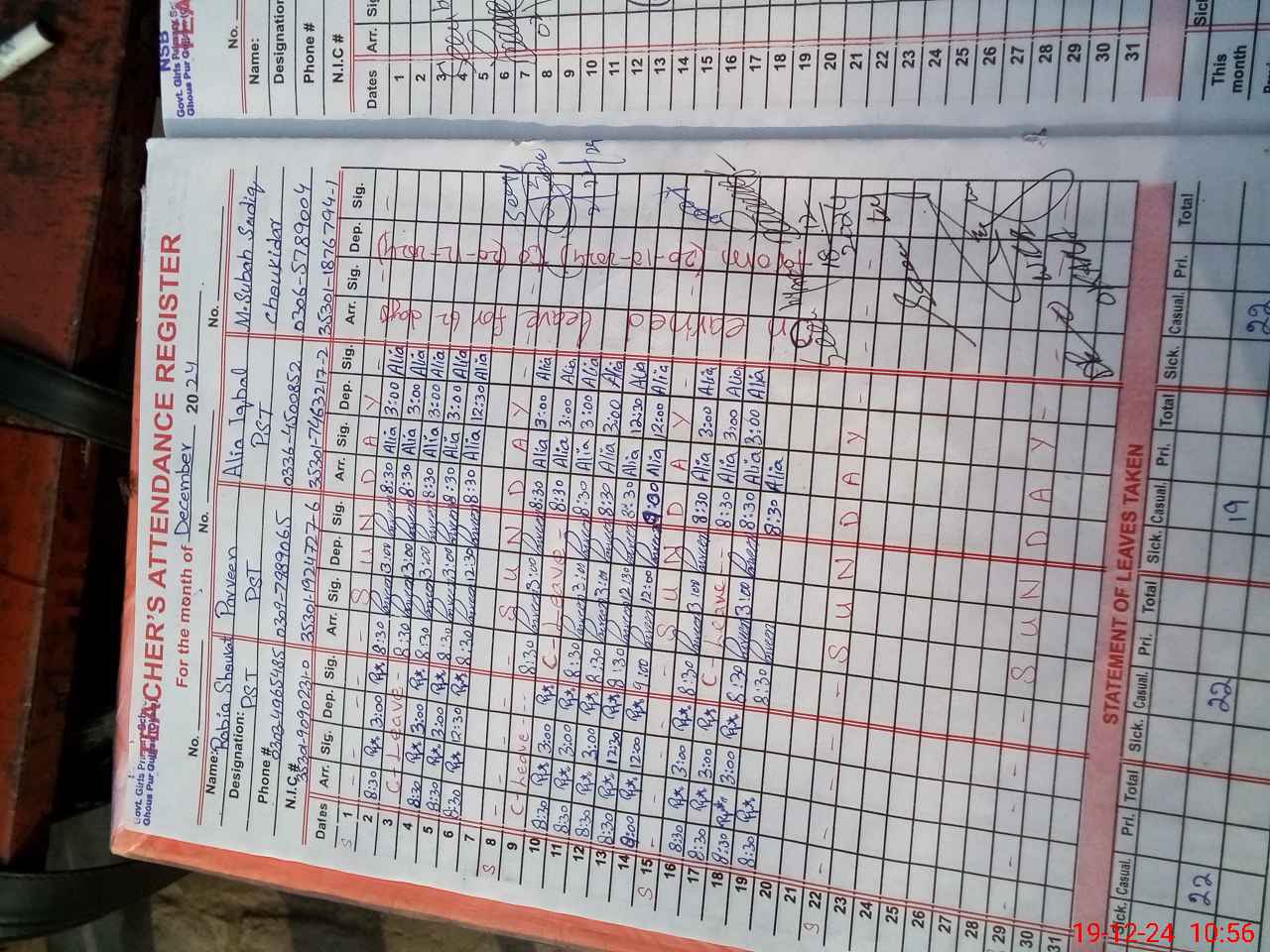 | CNIC | Full Name | Designation | R/C | Absence During Last Calender Month |