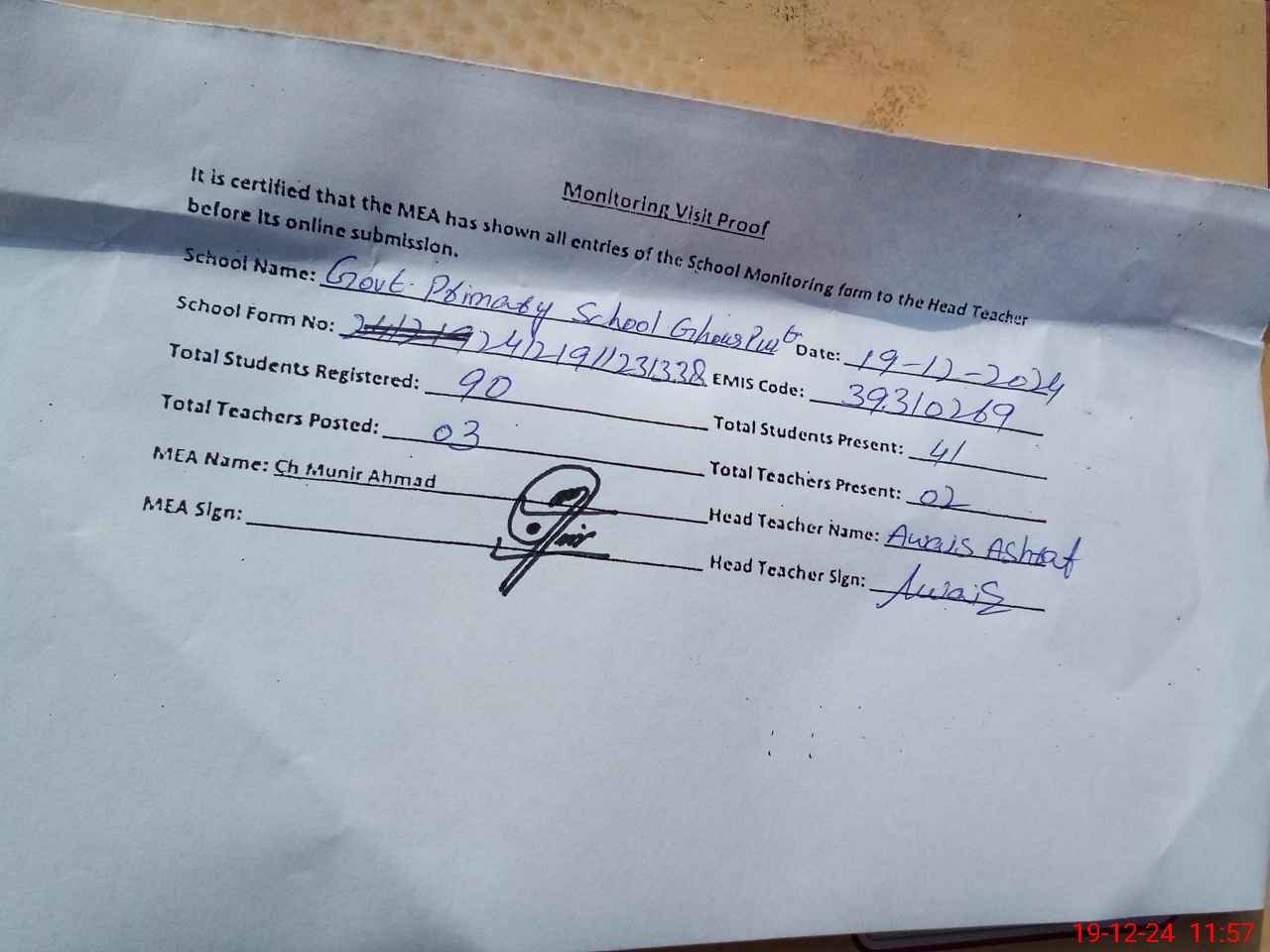 | Attendance Register | Head Teacher | MEA with School | Visit Proof |