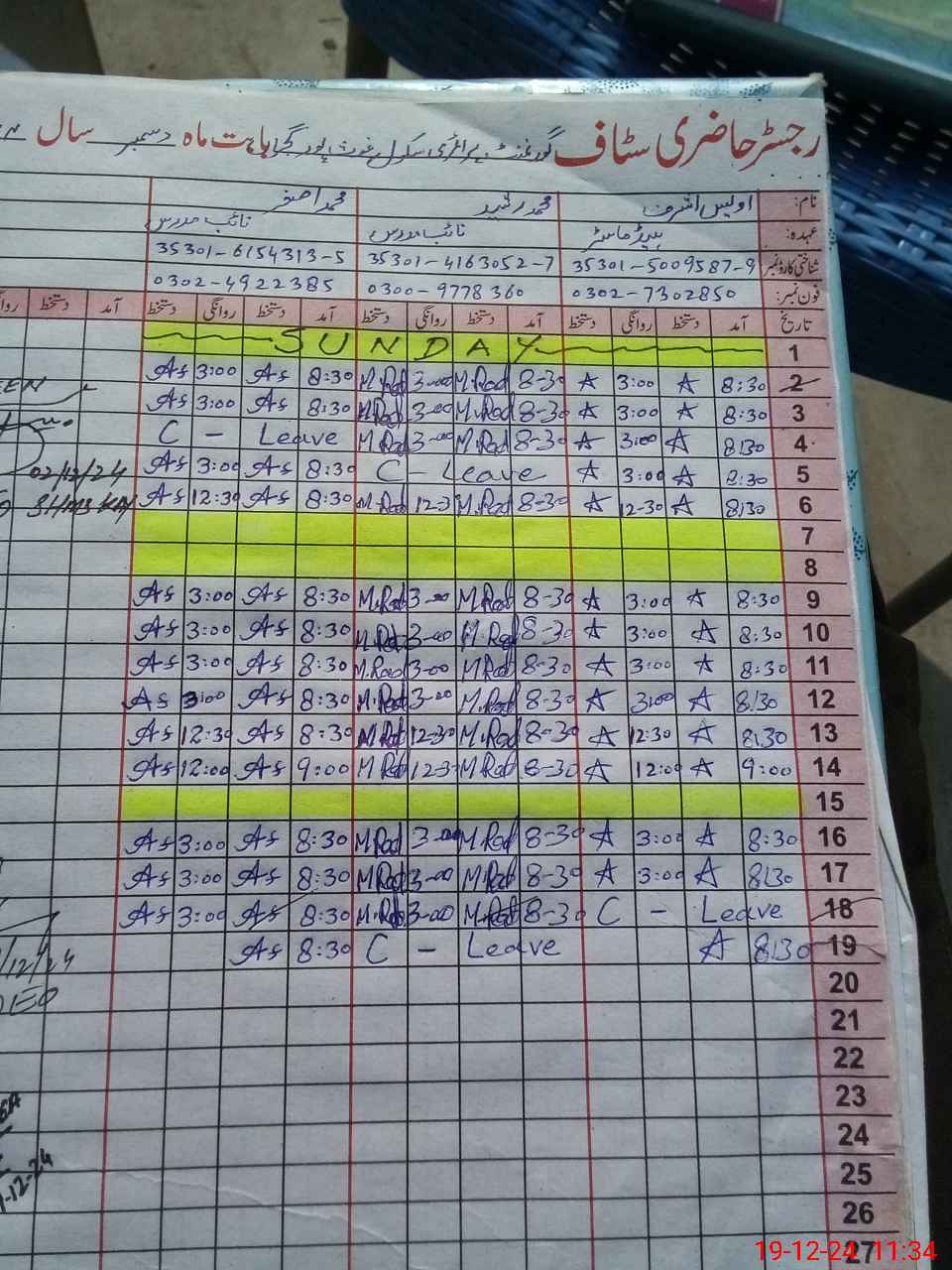| CNIC | Full Name | Designation | R/C | Absence During Last Calender Month |