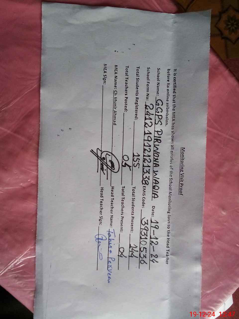 | Attendance Register | Head Teacher | MEA with School | Visit Proof |