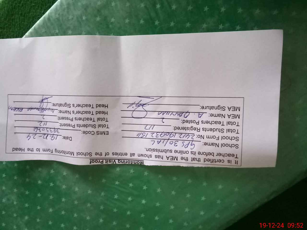 | Attendance Register | Head Teacher | MEA with School | Visit Proof |