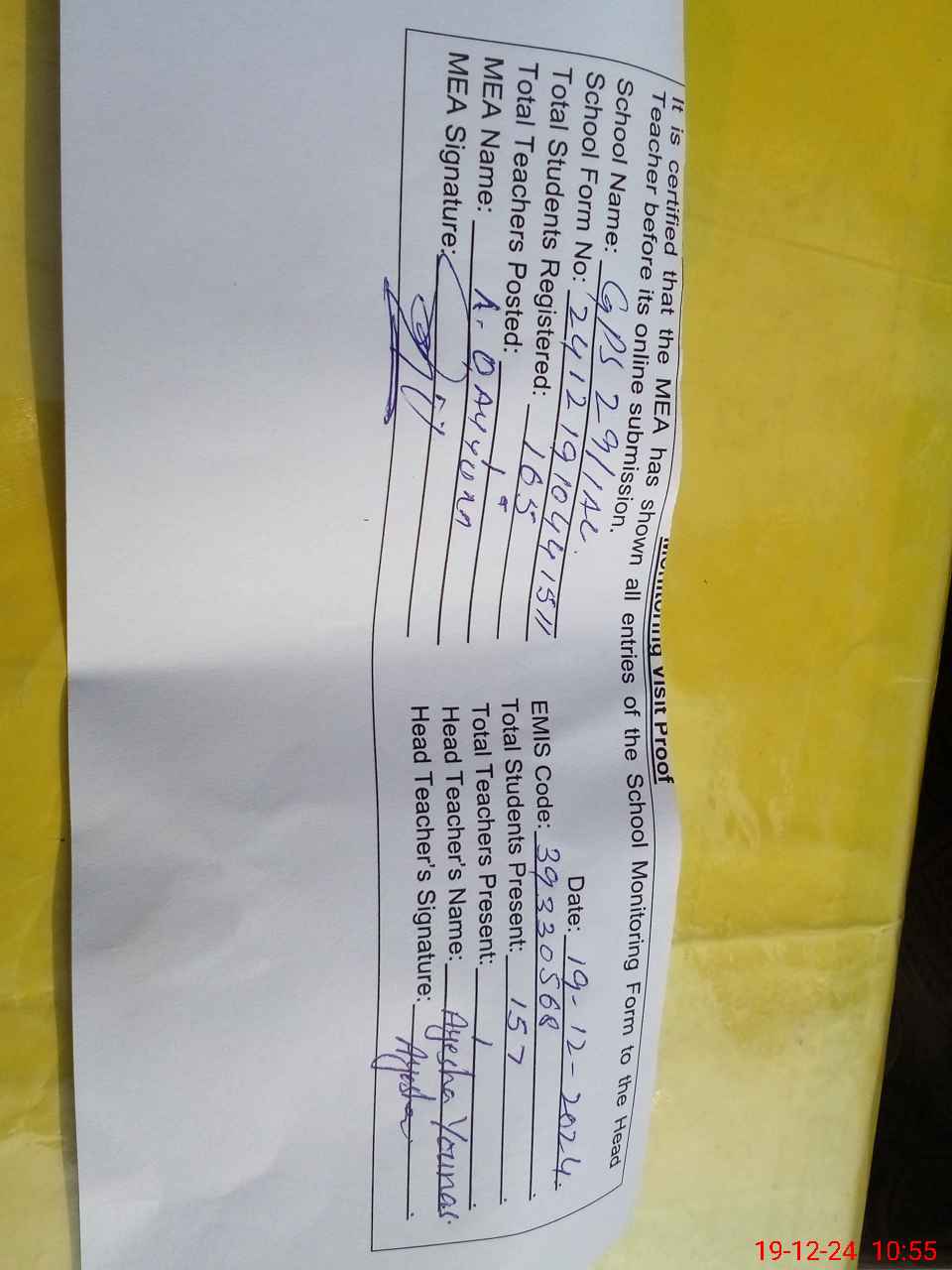 | Attendance Register | Head Teacher | MEA with School | Visit Proof |
