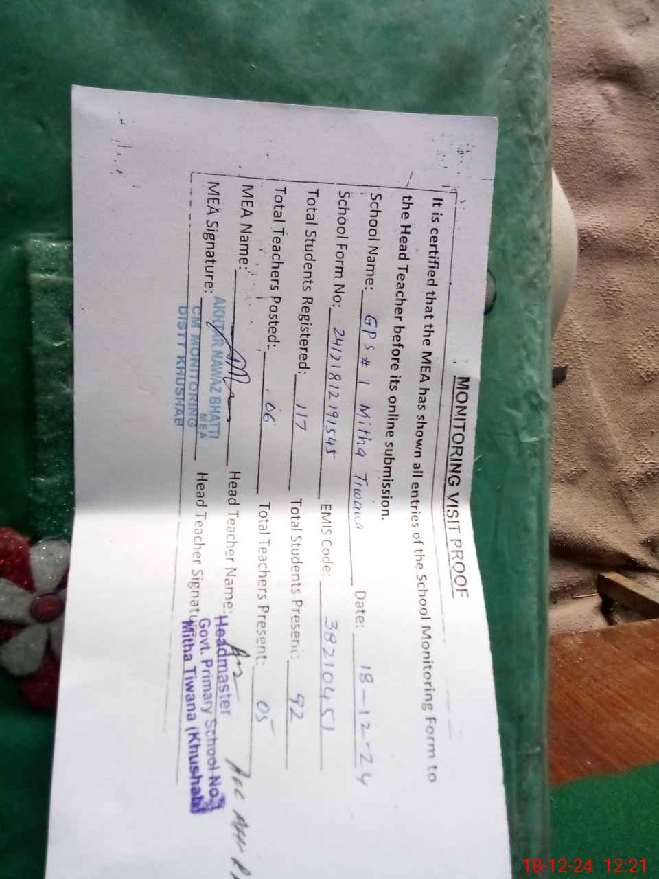 | EMIS Code: 38210451 | Name of School: GPS NO. 1 MITHA TIWANA | |||