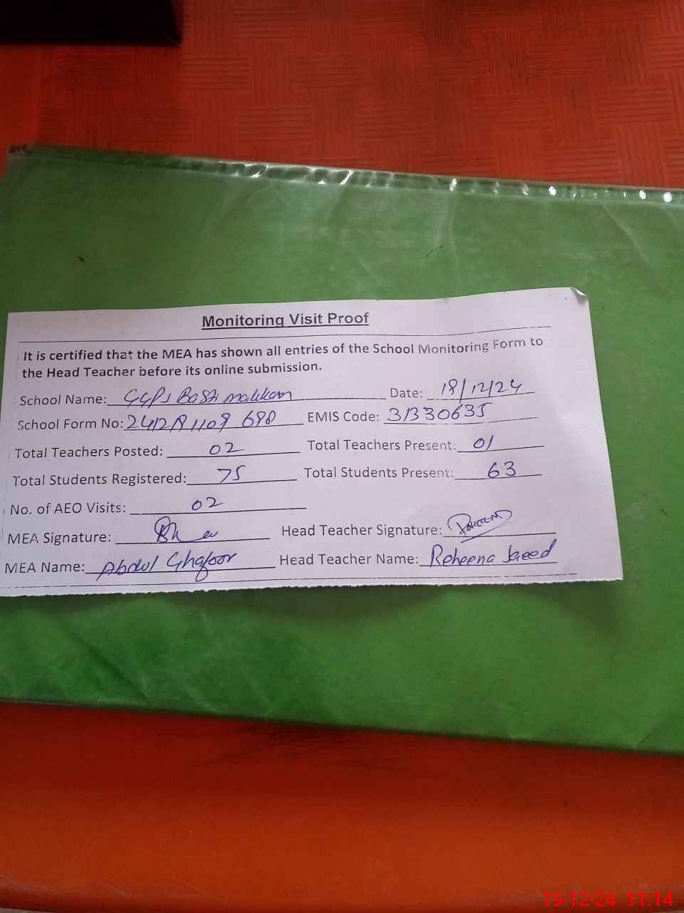| Attendance Register | Head Teacher | MEA with School | Visit Proof |