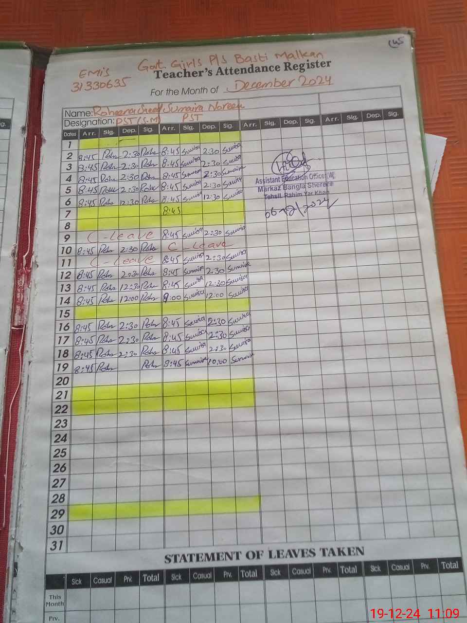 | CNIC | Full Name | Designation | R/C | Absence During Last Calender Month |