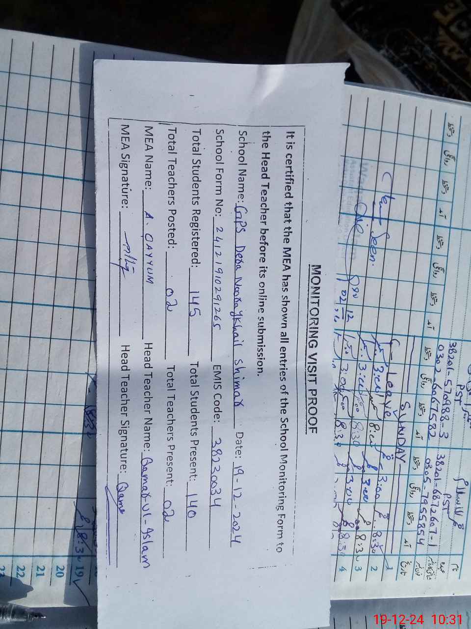 | Attendance Register | Head Teacher | MEA with School | Visit Proof |
