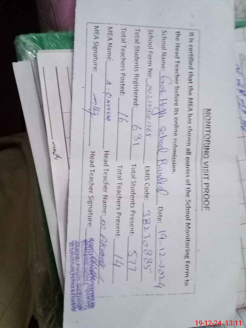 | Attendance Register | Head Teacher | MEA with School | Visit Proof |