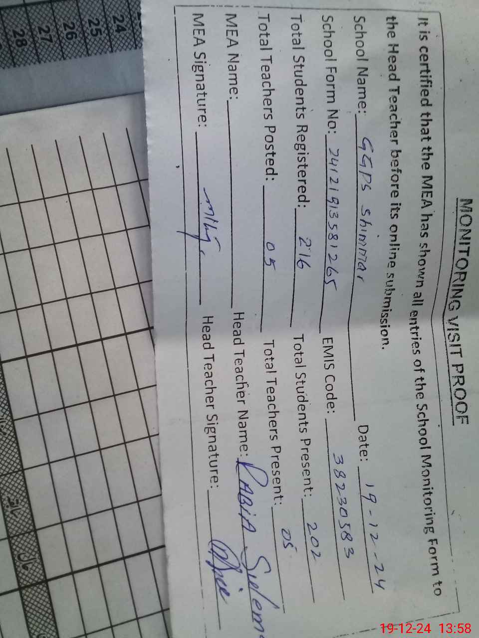 | Attendance Register | Head Teacher | MEA with School | Visit Proof |