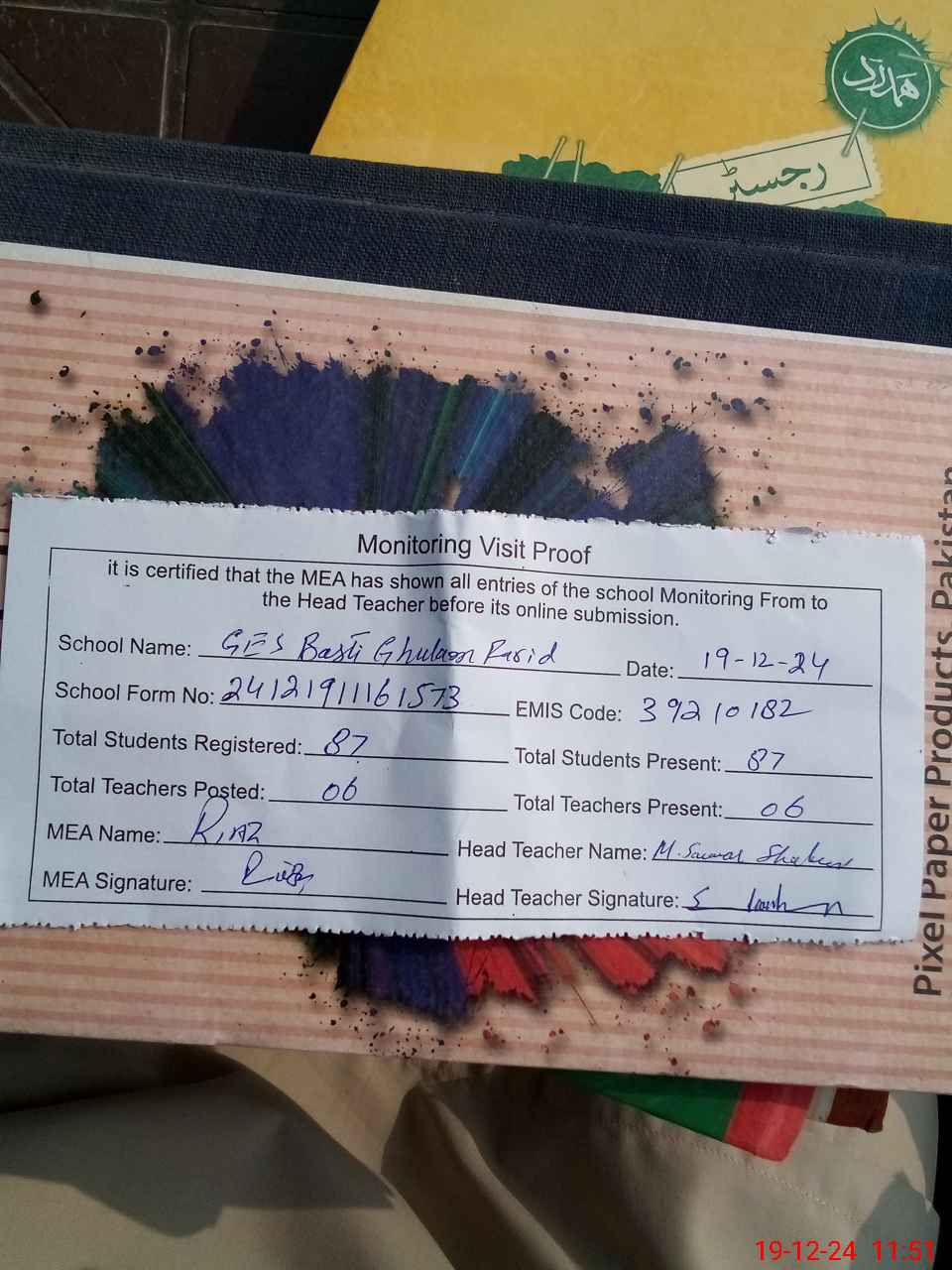 | Attendance Register | Head Teacher | MEA with School | Visit Proof |