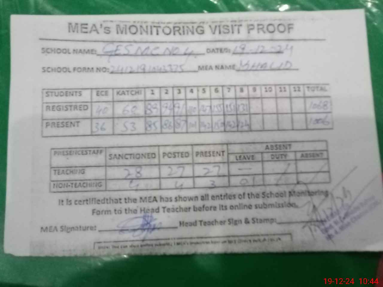 | Attendance Register | Head Teacher | MEA with School | Visit Proof |