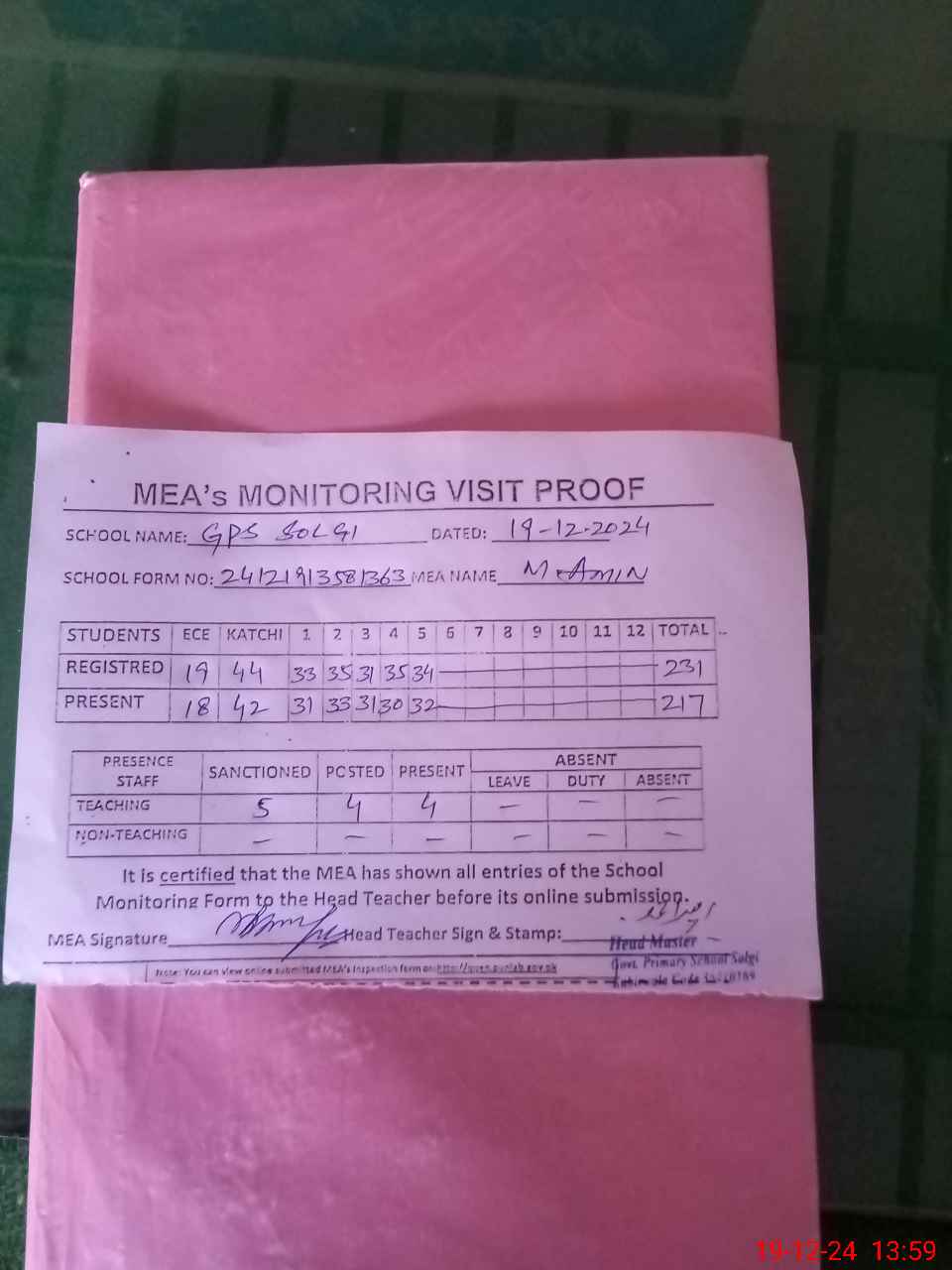 | EMIS Code: 36410169 | Name of School: GPS SOLGI, P/O JAWIND SING WALA, KABIRWALA | |||