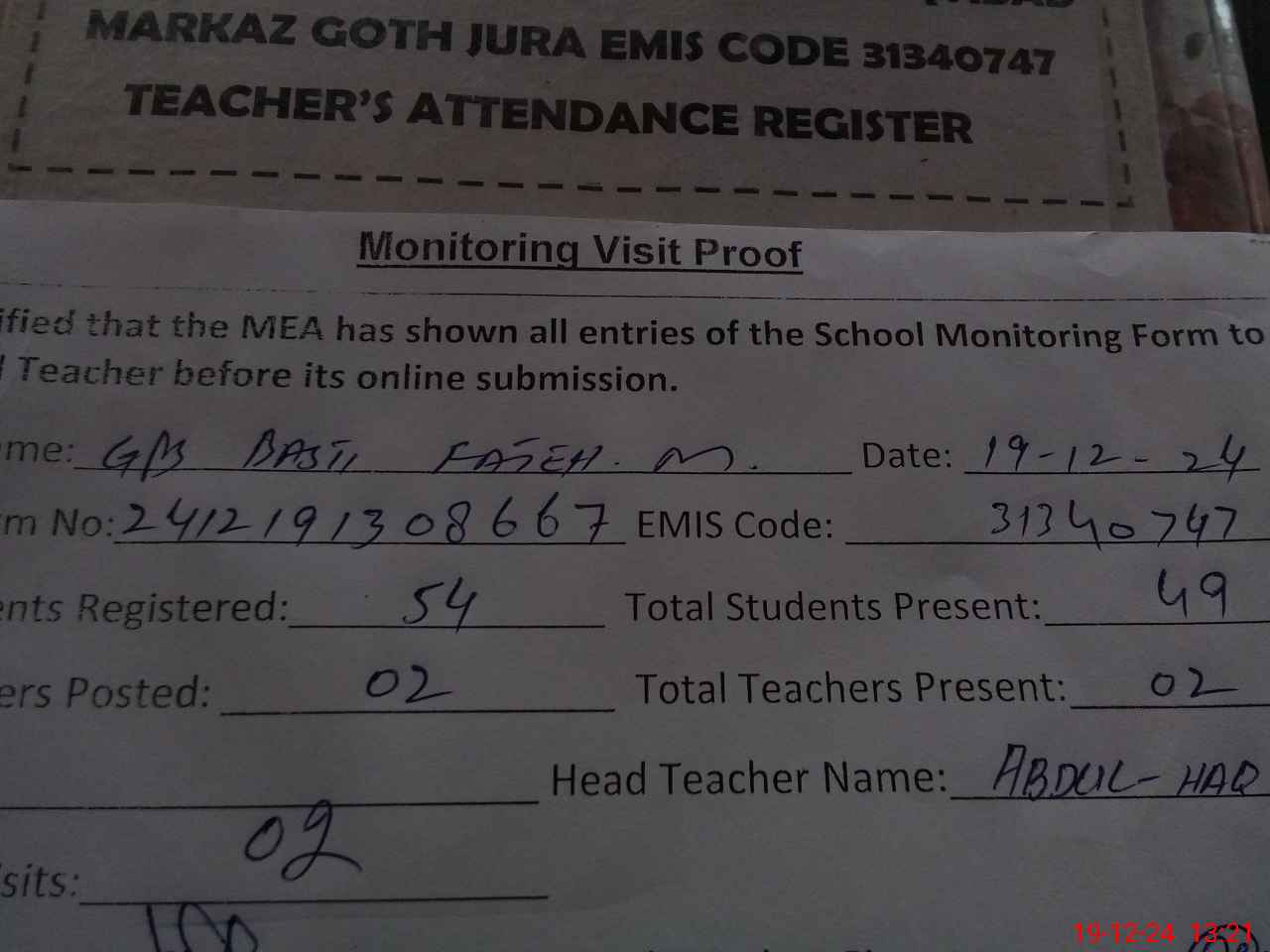 | Attendance Register | Head Teacher | MEA with School | Visit Proof |