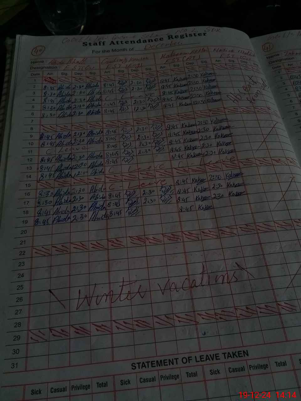 | Leave | Duty | Absent | Maternity | Medical | Ex- Pak |