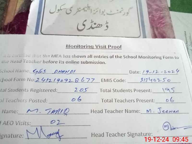 | Certified that this School was Inspected by the Undersigned MEA/DMO Today and the Information Stated Above is as Per Record. | |||||