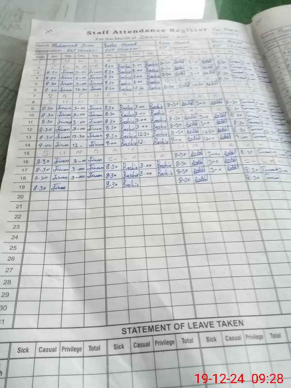 | CNIC | Full Name | Designation | R/C | Absence During Last Calender Month |