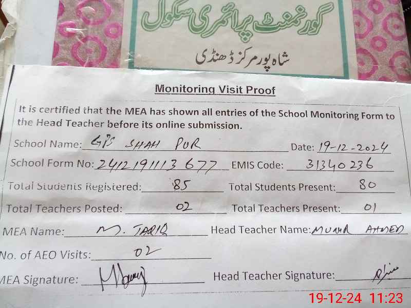 | EMIS Code: 31340236 | Name of School: GPS SHAH PUR PO DHANDI | |||