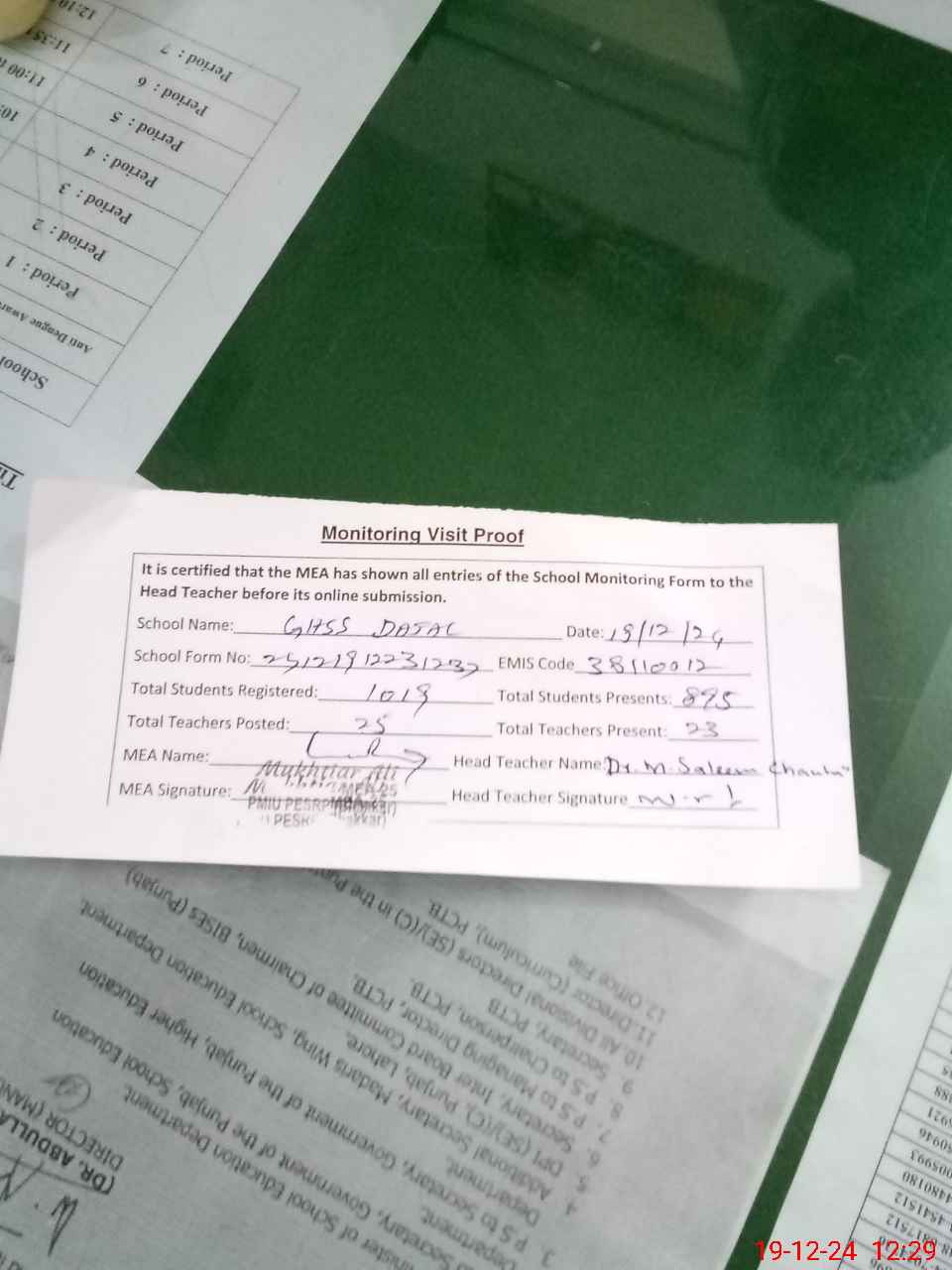 | Certified that this School was Inspected by the Undersigned MEA/DMO Today and the Information Stated Above is as Per Record. | |||||