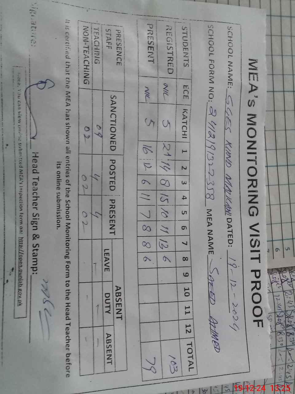 | Attendance Register | Head Teacher | MEA with School | Visit Proof |