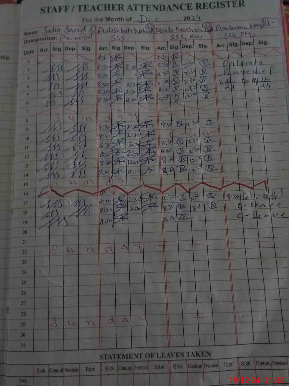 | CNIC | Full Name | Designation | R/C | Absence During Last Calender Month |