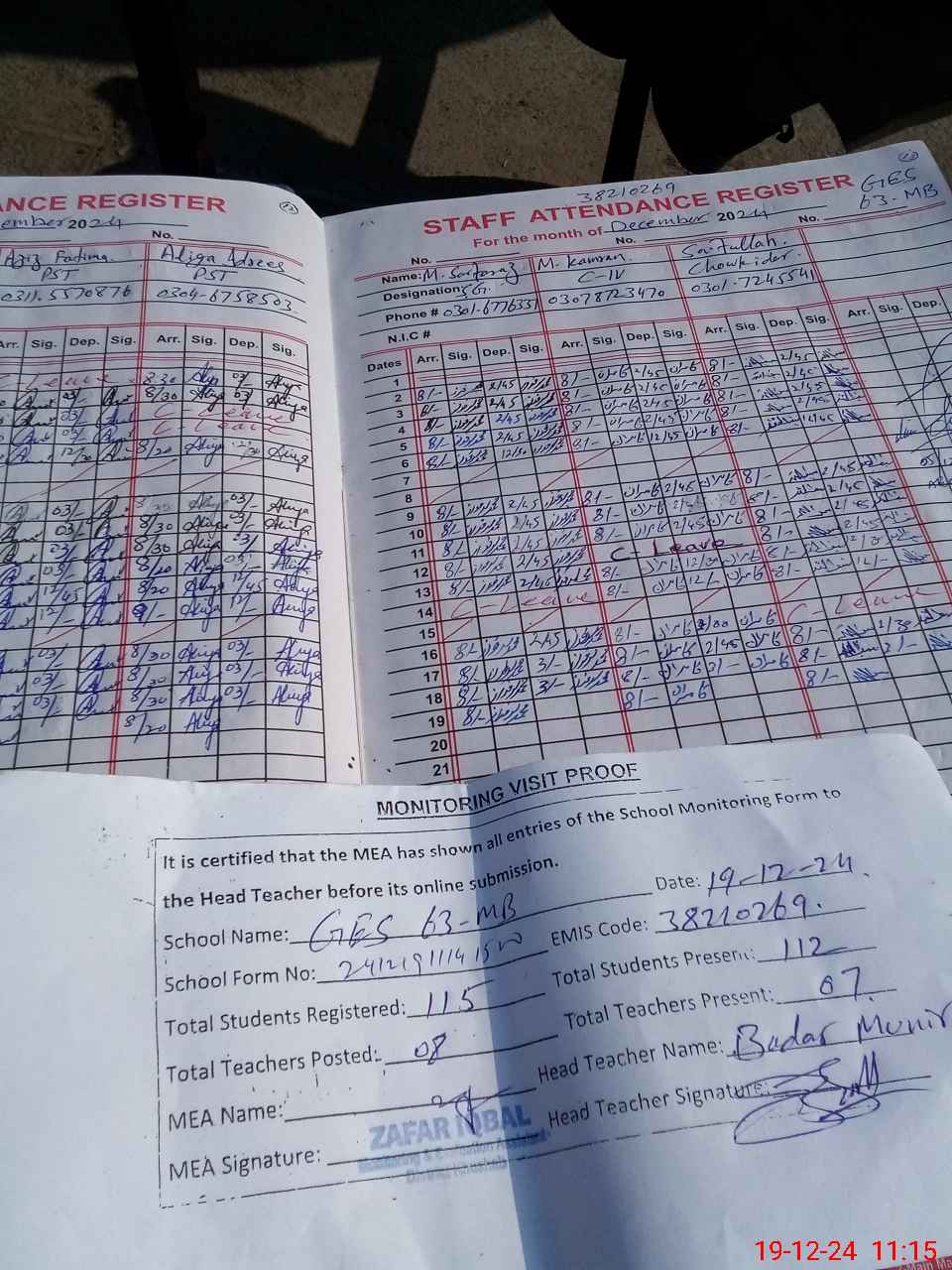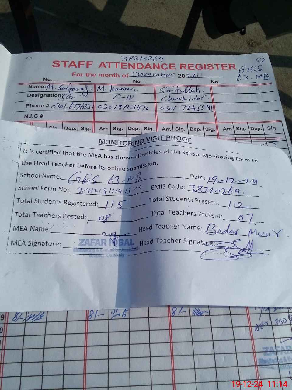| Attendance Register | Head Teacher | MEA with School | Visit Proof |