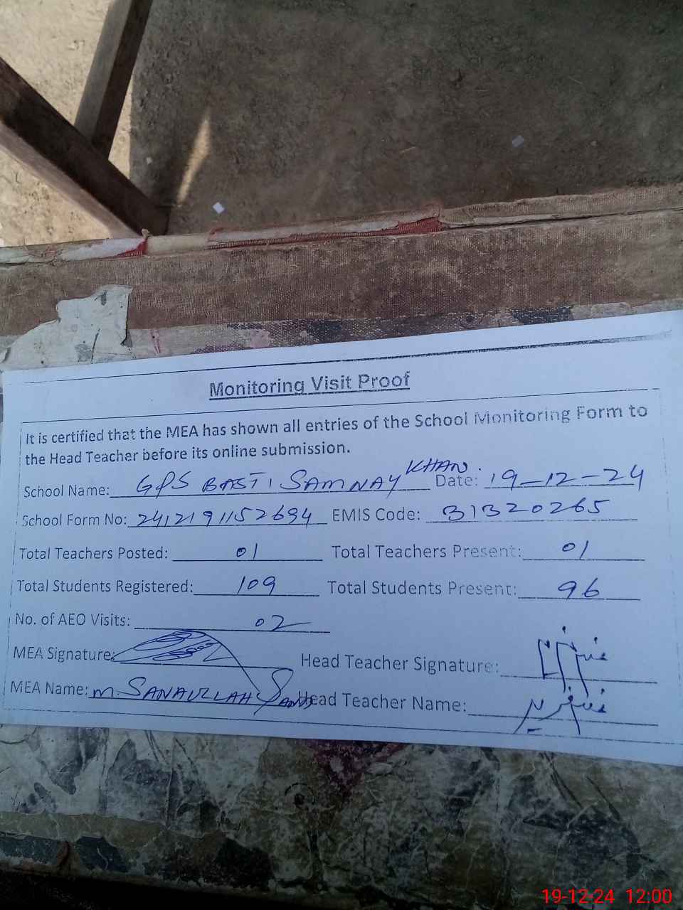 | Attendance Register | Head Teacher | MEA with School | Visit Proof |