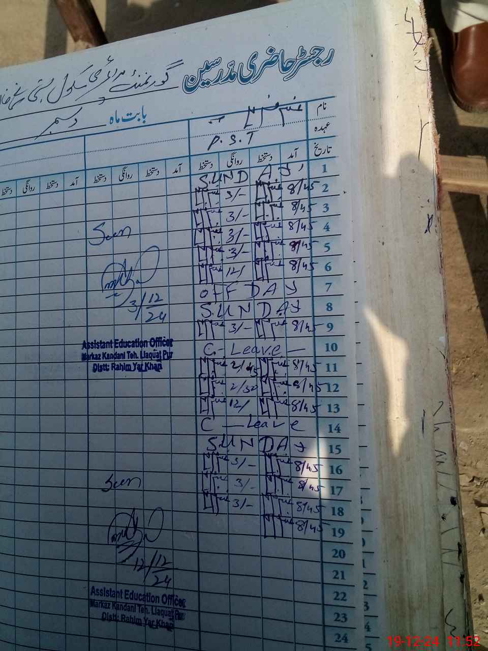 | CNIC | Full Name | Designation | R/C | Absence During Last Calender Month |
