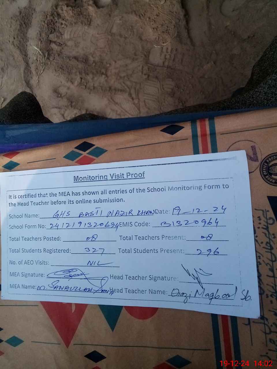 | Attendance Register | Head Teacher | MEA with School | Visit Proof |