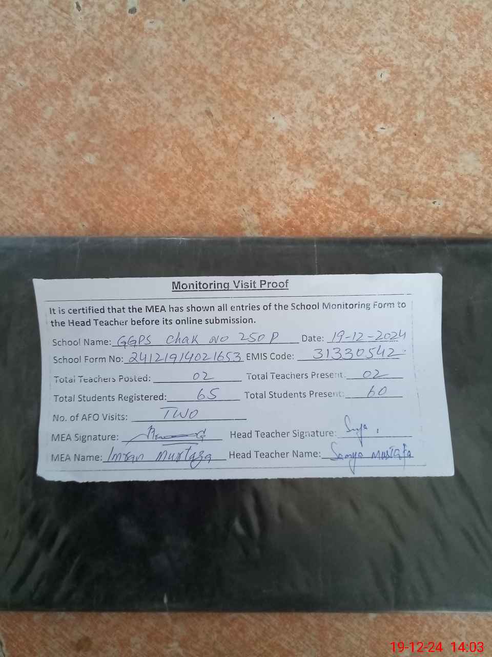 | Attendance Register | Head Teacher | MEA with School | Visit Proof |