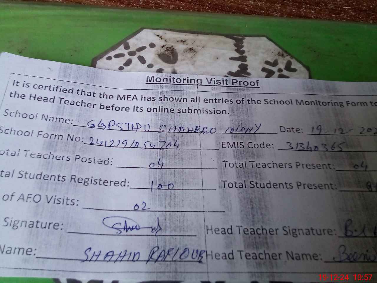| Attendance Register | Head Teacher | MEA with School | Visit Proof |