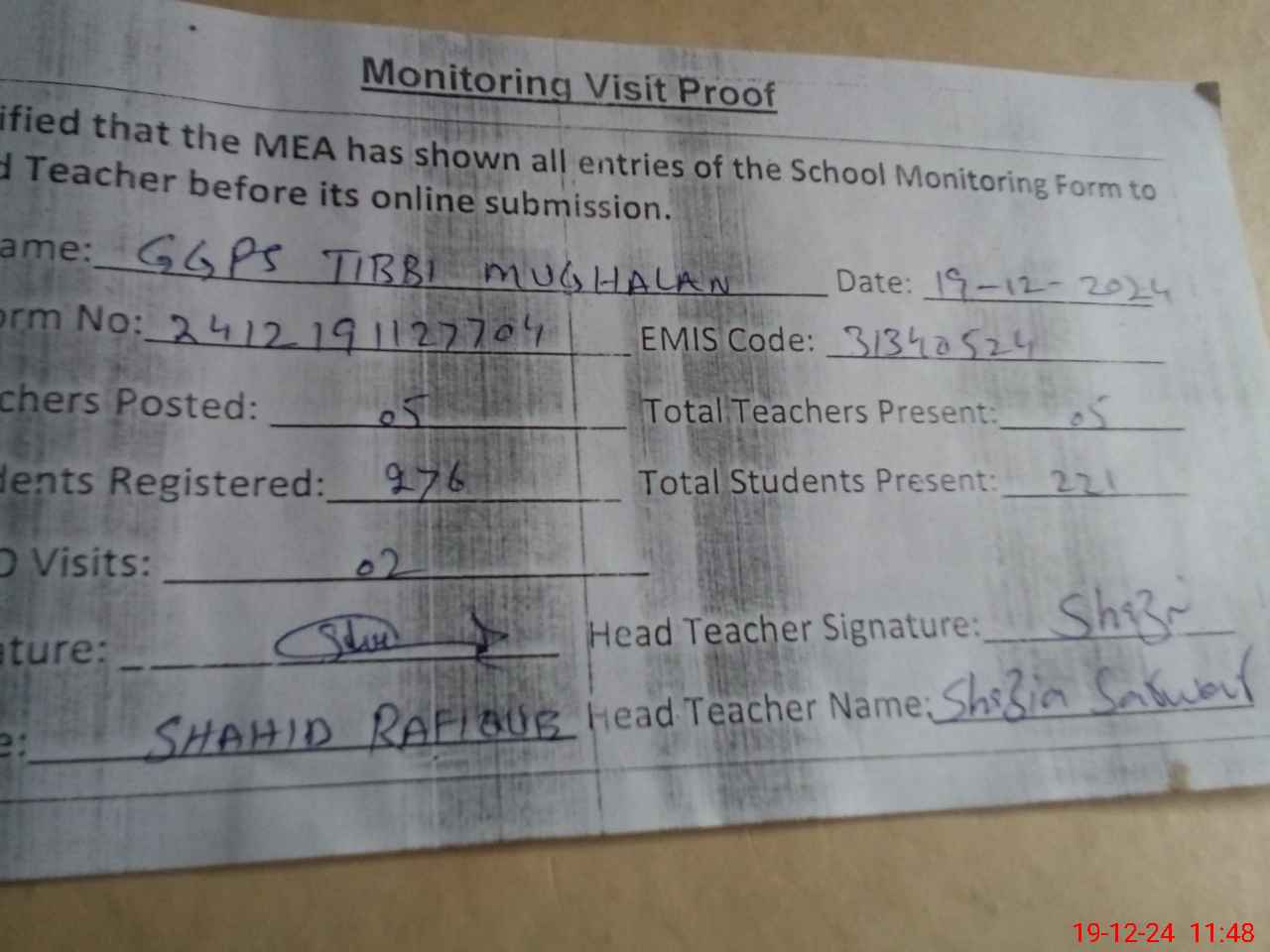 | Attendance Register | Head Teacher | MEA with School | Visit Proof |